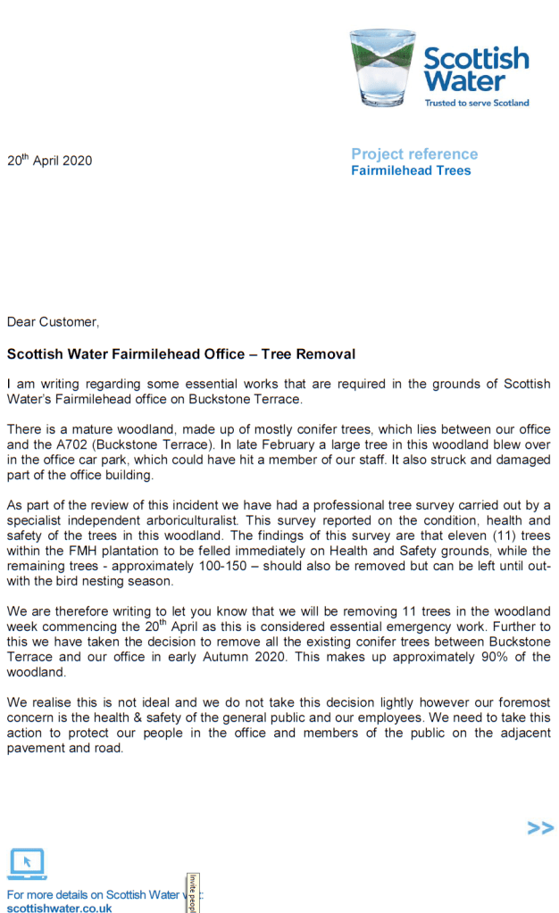 Scottish Water have been in touch to say they plan to fell their trees on Buckstone Terrace and then replant the area. Local residents have been issued letters (copy at the bottom of this post) explaining that this is due to safety concerns.