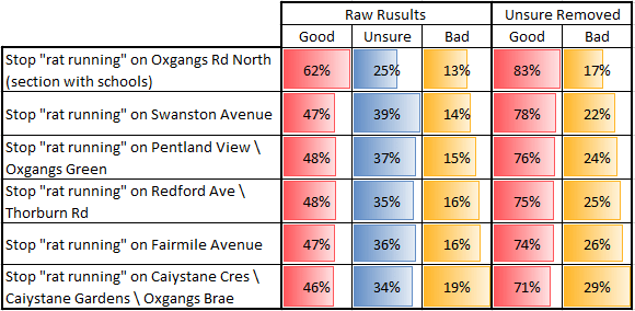 The results showed that there was overwhelming support for stopping vehicles using Oxgangs Road North as a local shortcut. When unsure responses were removed, there was also clear support for addressing the other local rat-runs.