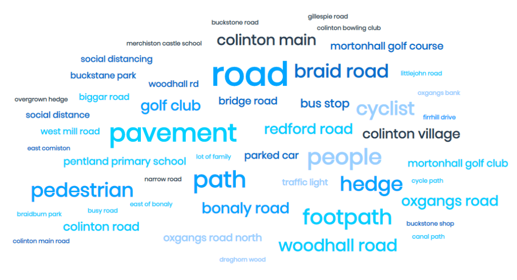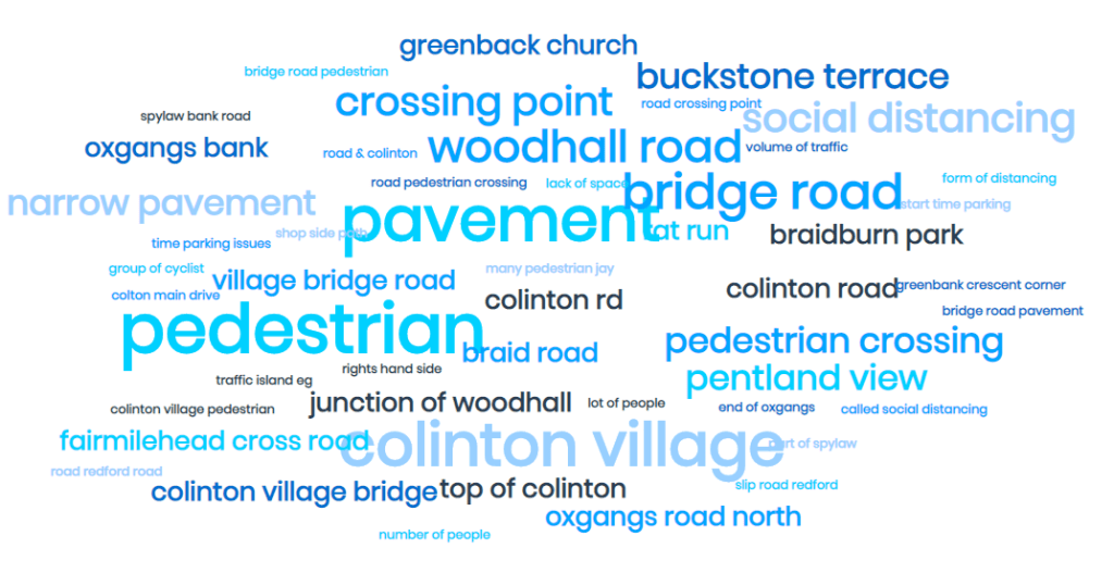 Crossing Points – I also took the opportunity to ask if there were any road crossing points where it may be difficult for pedestrians to maintain social distancing. The word-cloud diagram below shows the responses, but crossing points in Colinton Village were mentioned by 18 people, with one saying: