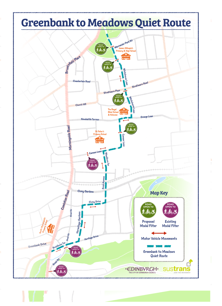 The Council is again saying the closure is needed to enable the Greenbank to Meadows Quiet Route. Although the Quiet Route plans now appear far less ambitious than I previously reported, the Council want to “maintain the existing Braid Road closure and introduce specific measures near the St Peter’s and James Gillespie’s schools to provide a coherent quiet connection from the Greenbank area through to the existing Meadows active travel network”.