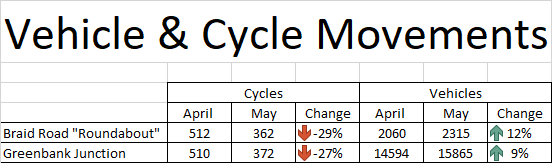 The data suggests that the total number of vehicles passing through Greenbank junction has increased by 9% whilst the number of bikes has dropped by 27%. The data also suggests that the total number of bikes passing through the junction on Braid Road (where the roundabout was) has increased by 12% whilst the number of bikes has dropped by 27%.