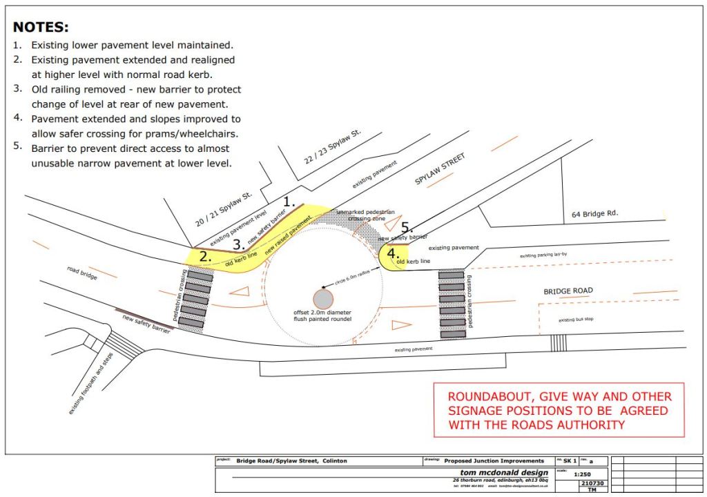 1. The proposed roundabout at the junction of Bridge Road and Spylaw Street; and,