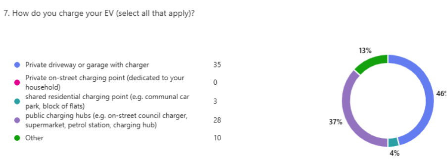 Analysis of charging behaviour among current EV owners highlights a critical structural challenge in the market. Just under 50% of respondents who currently own an EV, primarily rely on private charging facilities, such as a driveway or garage. This reliance demonstrates that the immediate accessibility of home charging is essentially a prerequisite for convenient EV ownership. Public charging hubs constitute the second most common method, while only 4% utilise shared residential charging points and none report access to private on-street chargers.