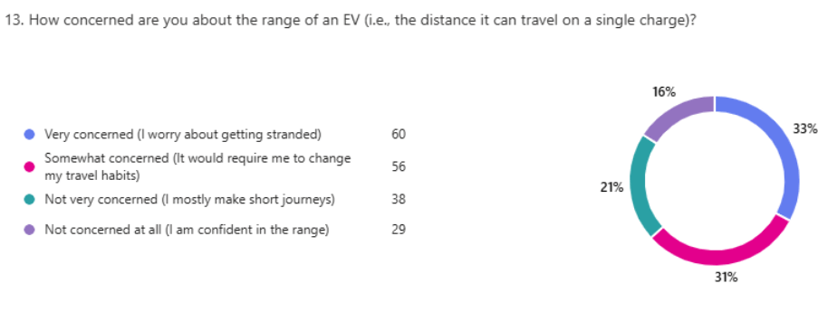 Range anxiety remains a prominent psychological barrier, with two-thirds of the sample expressing concern over battery range. Paradoxically, 71% simultaneously believe that an EV would meet their typical daily and weekly travel needs within and around the city. This disparity suggests that perceived range anxiety is not primarily driven by mileage requirements but is instead linked to concerns over charging infrastructure reliability i.e. the fear being not that the car cannot travel the distance, but that an available and functional charger will not be present at the destination.