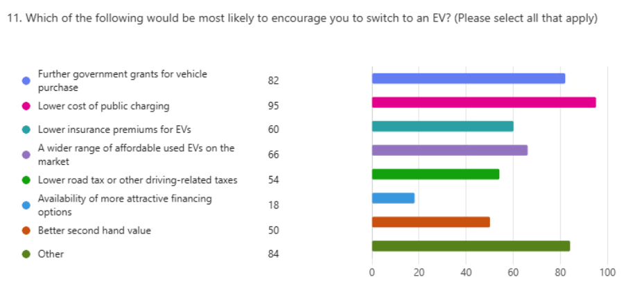 Two-thirds of respondents believe the overall cost of EV ownership is currently more expensive than equivalent petrol or diesel vehicles, with only 16% viewing EVs as cheaper. When asked for the most effective incentives to encourage switching, respondents prioritised lowering the cost of public charging and increasing the value or availability of government grants for vehicle purchase.