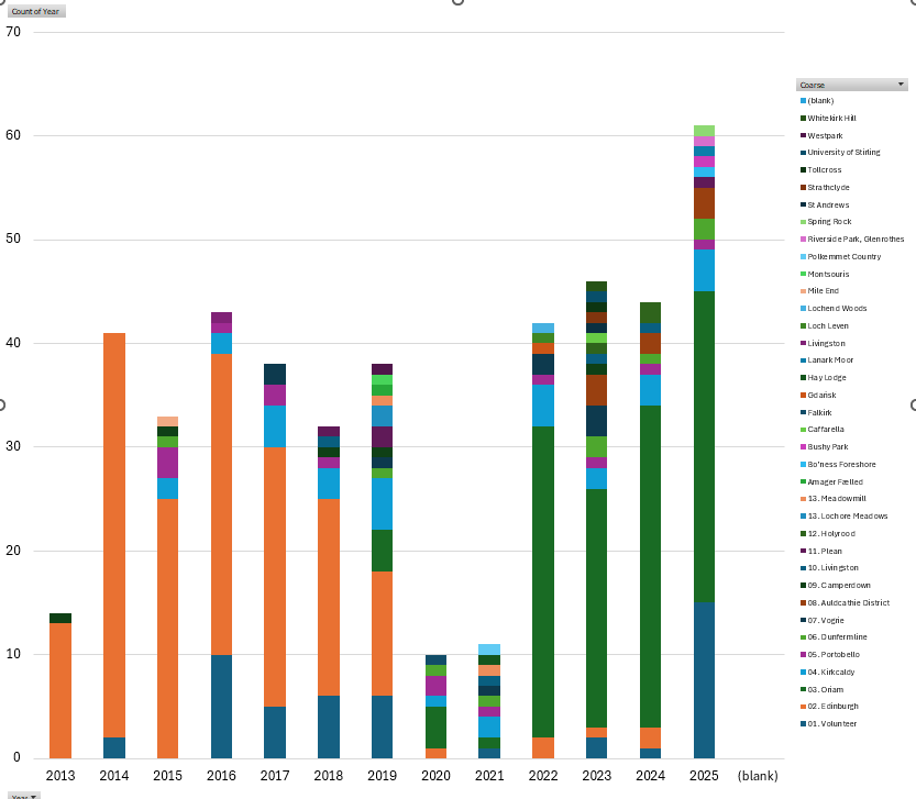 My operation was in December 2015, and early 2016 saw a spike in volunteering as I recoverdd, 10 times in just a few months. Back then, Edinburgh parkrun (Cramond) was my home course, and with 168 completions and numerous volunteer stints, it remains the one I’ve attended most.